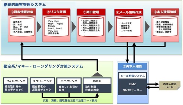 UI銀行は、口座開設から預金管理までスマートデバイスを活用した非対面チャネルで取引を行っています。その中で、顧客管理のさらなる強化をはかっていくため、顧客ごとのリスク要因判定で精緻なリスク評価、リスクランクと直近本人確認日による期日管理、再本人確認の案内メール発信、確認結果のDB(データベース)化を実現することが喫緊の課題となっていました。