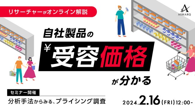 株式会社アスマーク(東京都渋谷区東、代表取締役:町田正一)は、2024年2月16日(金)12:00に、商品やサービスの適正価格・受容価格におけるリサーチ活用をテーマとし、セミナーを開催いたします。