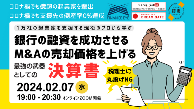株式会社ファイナンスアイ(本店:大阪府大阪市、代表取締役:田中 琢郎。以下、ファイナンスアイ)は起業家・経営者の未来を左右する決算書を最強の武器として活用するためのセミナー【銀行の評価を上げ融資を成功させ、M&Aの売却価格を上げる『決算書戦略』】を開催します。1万社の起業家や経営者を支援し、コロナ禍でも億超の起業家を輩出し続けたファイナンスアイが、金融機関の融資審査の目線とM&AのDD調査人の目線を加えて、事業評価を上げる戦略的決算書の創造について伝えます。開催日時は2024年2月7日(水)19:00にウェビナー形式で開催します。決算書戦略で経営の未来はがらりと変わります。2024年の成功に向けて躍進するきっかけにしてもらえればと思います。